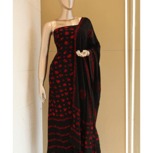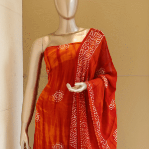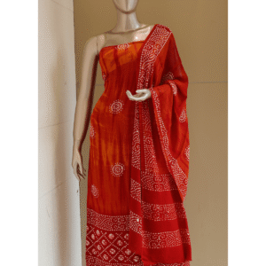 Traditional Indian ethnic wear with kurta, churidar bottoms, and dupatta, featuring wax-resist prints, tie-dye effects, and floral embroidery motifs.