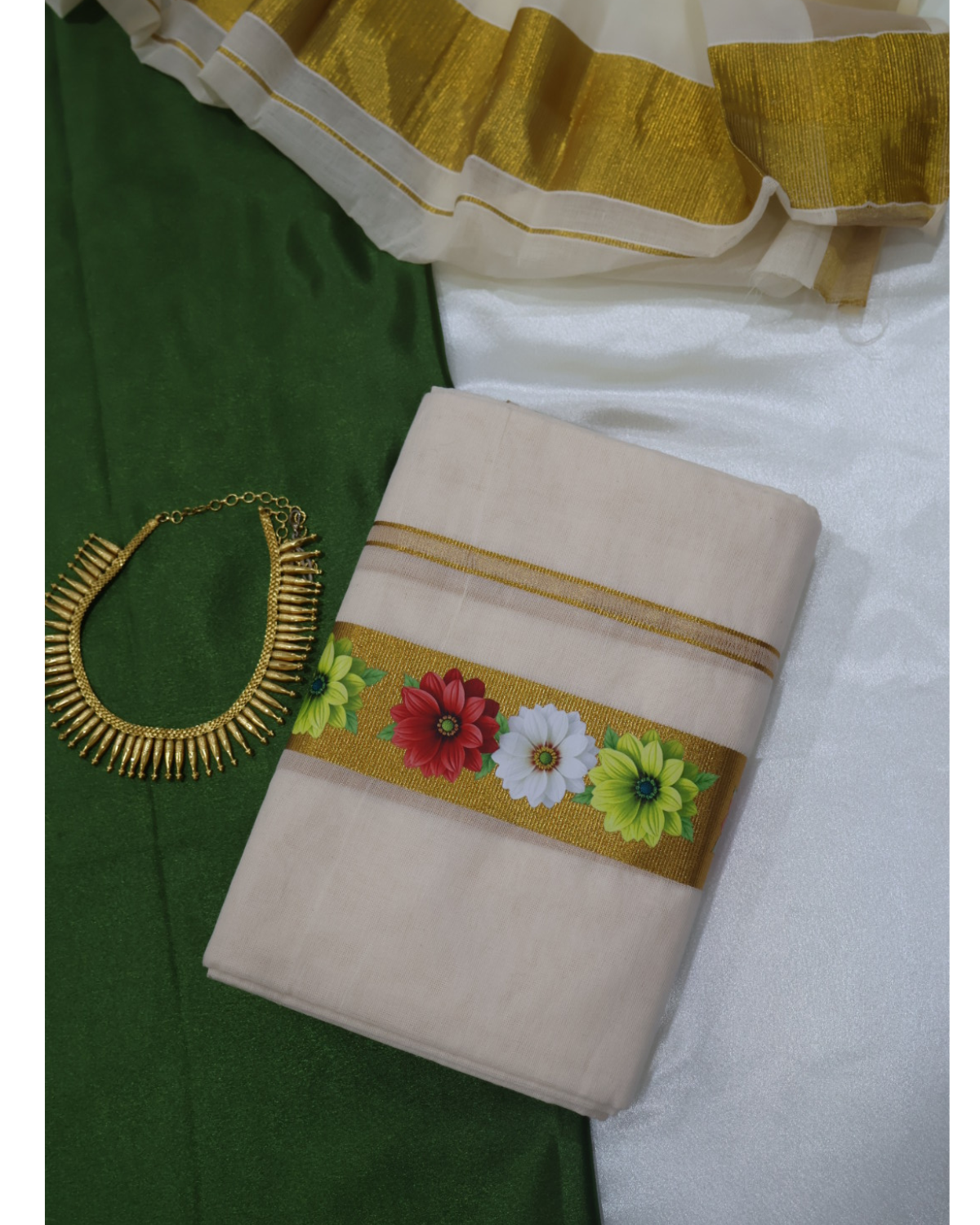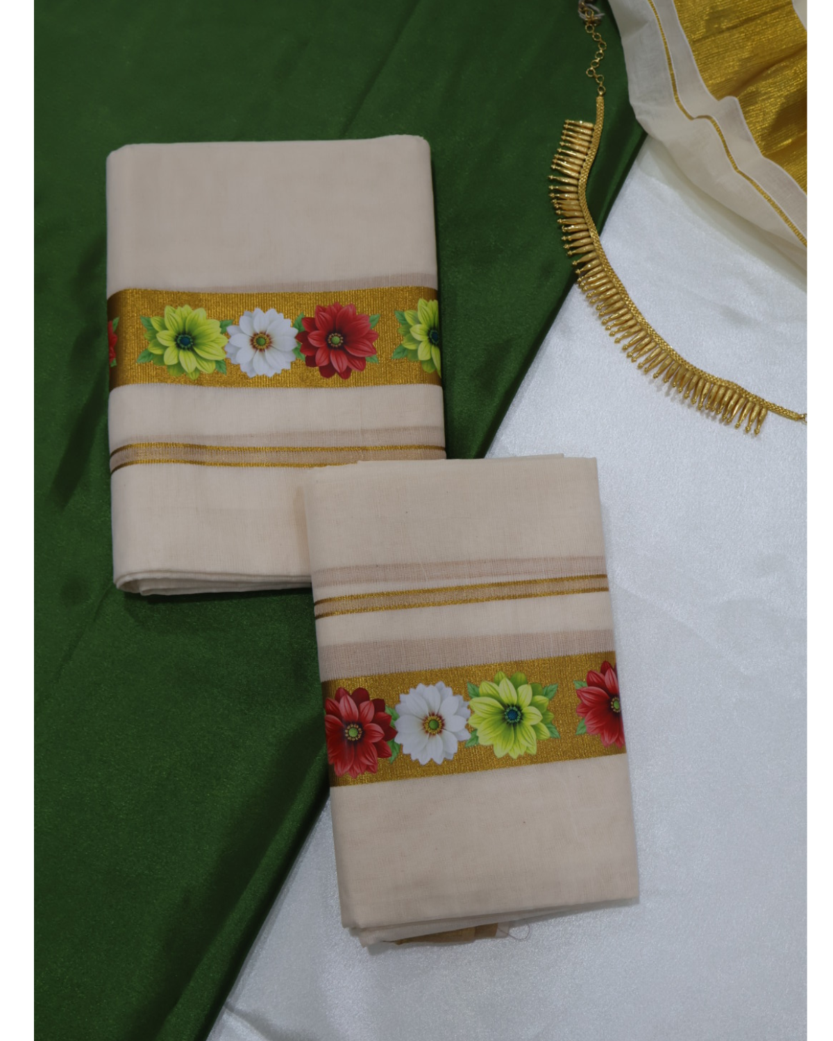 This elegant Set Mundu (Mundum Neriyathum) combines traditional Kerala heritage with a touch of modern minimalism, making it a perfect choice for festive occasions, weddings, or temple visits.