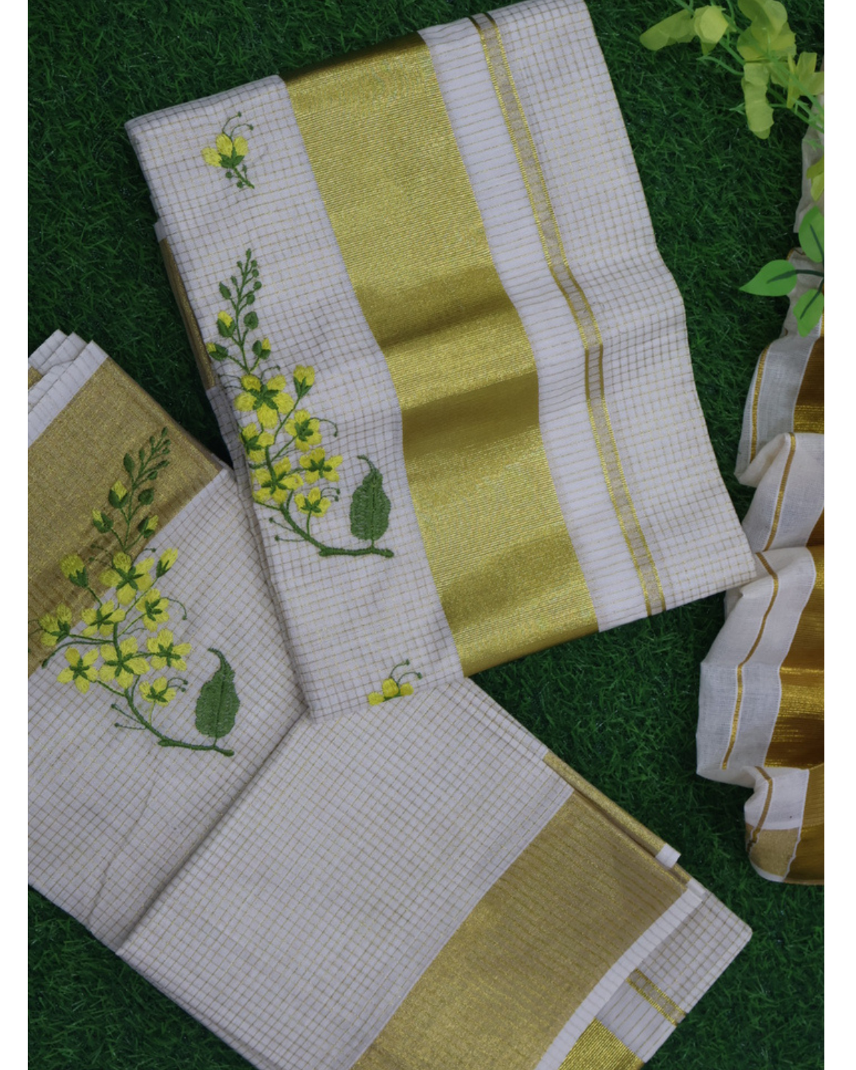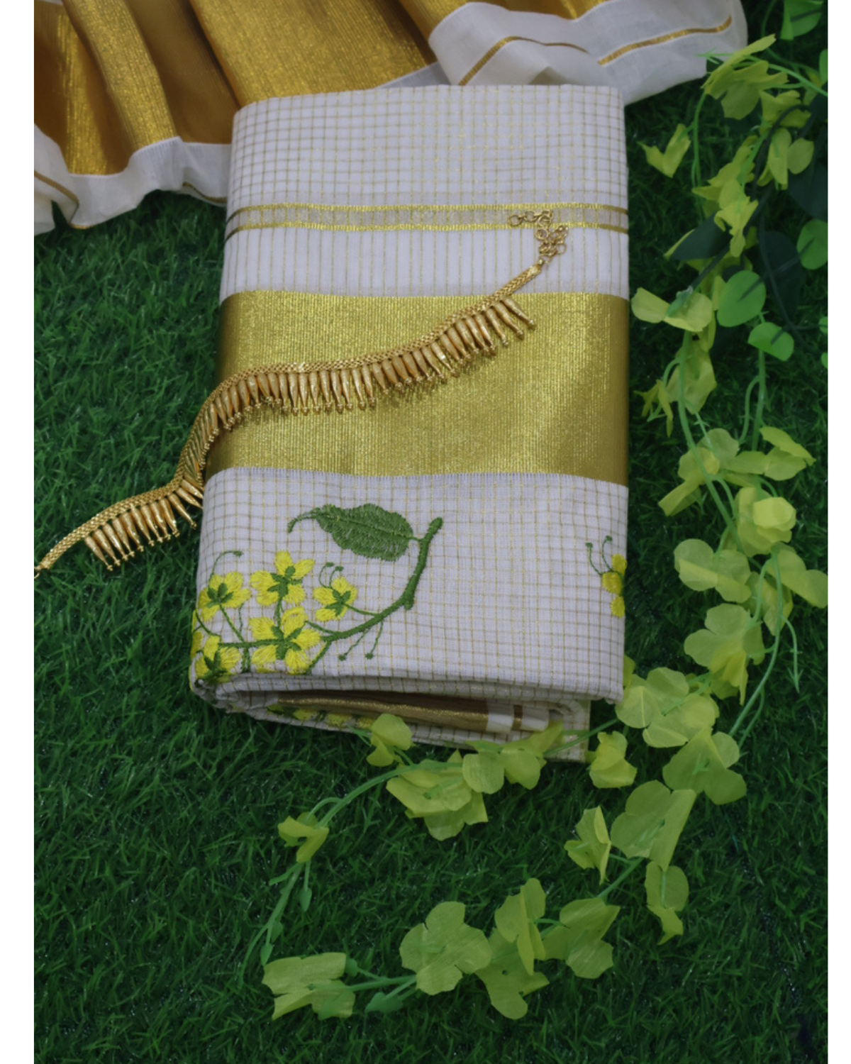 This elegant Set Mundu (Mundum Neriyathum) combines traditional Kerala heritage with a touch of modern minimalism, making it a perfect choice for festive occasions, weddings, or temple visits.